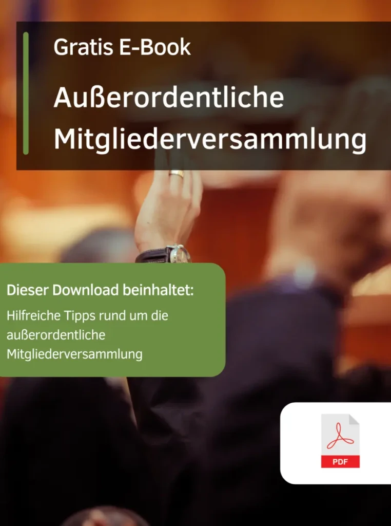 Eine außerordentliche Mitgliederversammlung läuft vom Grundsatz her genauso ab wie eine ordentliche – es sei denn, die Satzung Ihres Vereins enthält für den Ablauf besondere Regelungen. Sichern Sie sich jetzt mit unserem kostenlosen E-Book hilfreiche Tipps.